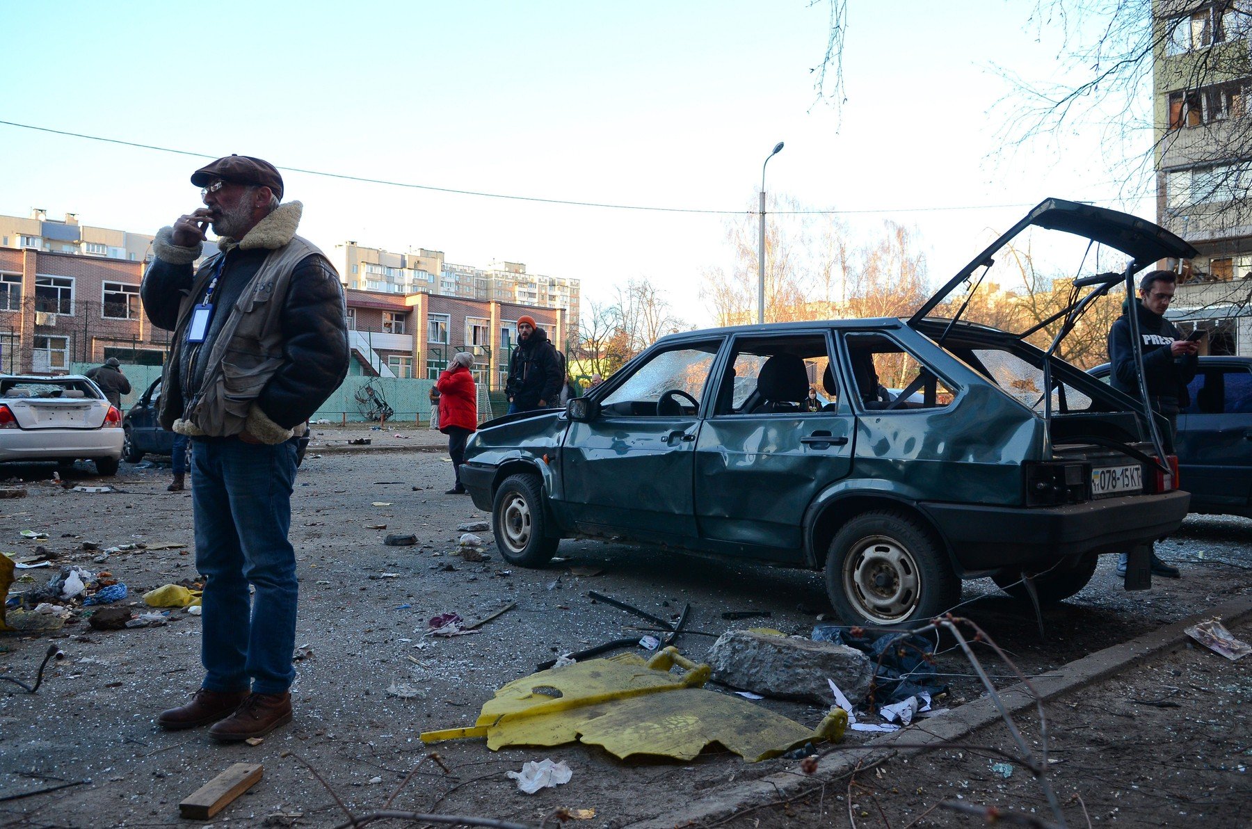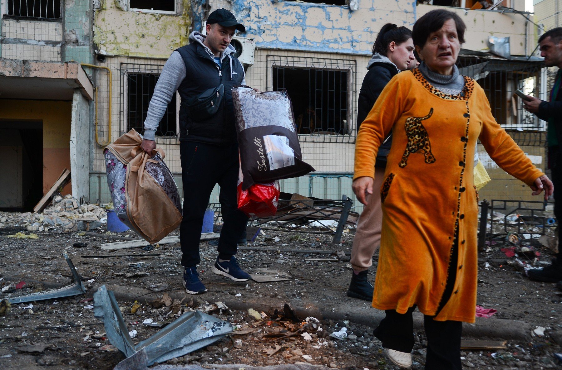 „Avem rădăcini în Kiev, suntem căsătoriți de 38 de ani”, afirmă Frida Maslovska, în vârstă de 71 de ani, relatând că explozia a zguduit pereții apartamentului ca un cutremur dar că soțul ei nu vrea să plece.