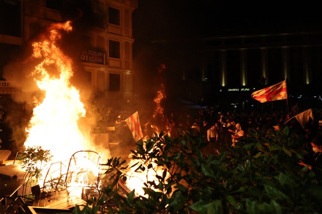 Protestatarii incendiază baricade și se ciocnesc cu forțele de ordine în timpul unui miting al opoziției, organizat în ziua alegerilor locale, în centrul orașului Tbilisi. Foto: Giorgi Arjevanidze / AFP / Profimedia