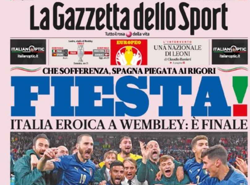 Gazzetta dello Sport: „Basmul azzurro şi nopţile magice continuă. Suntem în finală. Italia a zburat din nou, visul continuă. Duminică ne reîntoarcem pe Wembley şi vom evolua cu trofeul pe masă, după un parcurs extraordinar”.
