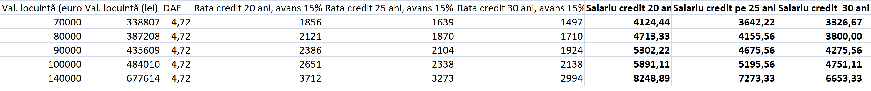 Apoi, în calculele utilizate am folosit un DAE de 4,72%, ca medie a dobânzilor practicate în piață de principalii jucători. Există bănci care au dobânzi ușor mai mici așa cum sunt și bănci care utilizează un cost al banilor mai ridicat. Media este de circa 4,72%. De asemenea, am optat pentru varianta în care ratele rămân egale pe toată maturitatea împrumutului (mai există și varianta ratelor descrescătoare, dar am optat în calcule pentru varianta cu rate egale)