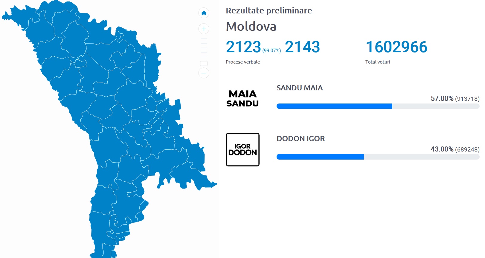 Astfel, datele centralizate de Comisia Electorală Centrală de la Chișinău, după numărarea a peste 99% din voturi (2.123 din totalul de 2.143 de secţii de votare) arată că Maia Sandu a fost votată de 57% dintre alegători (913.718 de voturi), în timp ce contracandidatul său Igor Dodon a fost votat de 43% (689.248 de alegători).