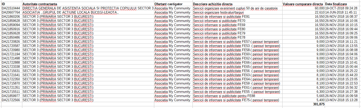 Asociația care a câștigat procedura de achiziție a încheiat din 2015 mai multe contracte cu Primăria Sectorului 3, pentru evenimente cultural -artistice dedicate Craciunului, sărbătorirea a 50 de ani de căsătorie și servicii de informare și publicitate.