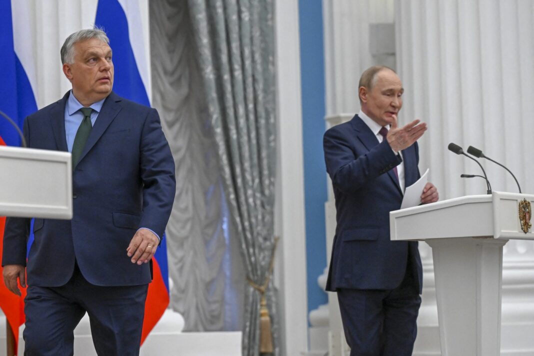 Premierul ungar Viktor Orban și președintele rus Vladimir Putin, într-o conferință de presă la Kremlin, Moscova, Rusia, 5 iulie 2024.