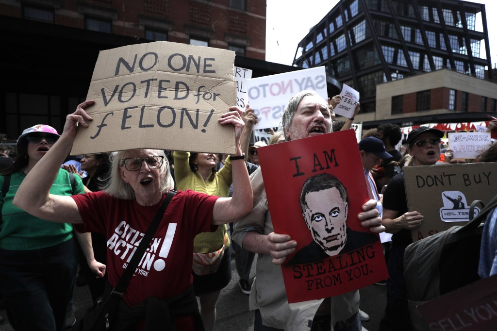 La New York, câteva sute de protestatari anti-Tesla s-au adunat sâmbătă în fața showroom-ului companiei din Manhattan. Sophie Shepherd, în vârstă de 23 de ani, organizatoare din partea grupului Planet Over Profit, a explicat că manifestația nu vizează protestul împotriva mașinilor electrice.