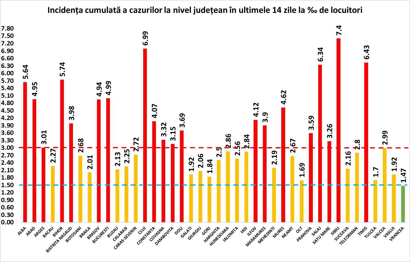 Județul Sibiu are o incidență a cazurilor la mia de locuitori, în ultimele 14 zile, de 7,4. În Cluj aceasta este de 6,99, în creștere față de ziua precedentă. Peste 6 se mai înregistrează în Sălaj – 6,34, și Timis – 6,43