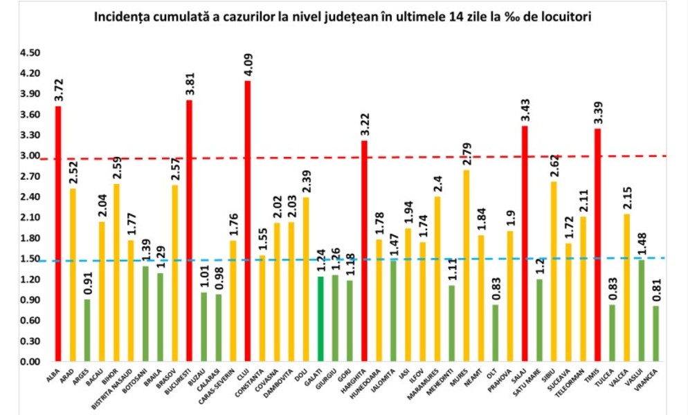 În București, indicele este de 3,81. În total, cinci județe și Capitala au peste 3 cazuri la mia de locuitori, medie pe ultimele 14 zile.