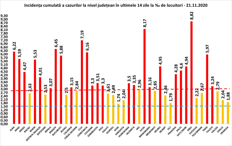 25 de județe și Capitala sunt în zona roșie de COVID-19, în București rata de infectare fiind în continuare în creștere, respectiv 5,88 față de vineri, când a fost 5,79. De asemenea, continuă să crească și în Ilfov indicele de infectare la mia de locuitori, ajungând la 8,17, față de 7,89 cu o zi în urmă. În schimb, rata de infectare continuă să scadă în Sibiu, însă rămâne cea mai ridicată din țară.