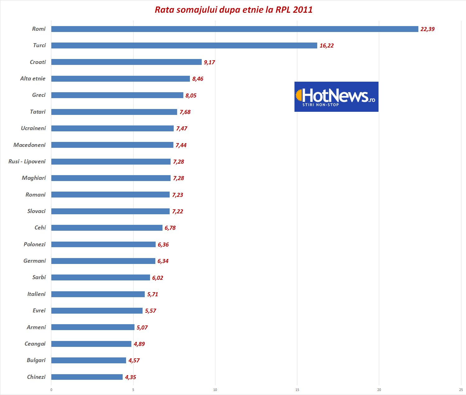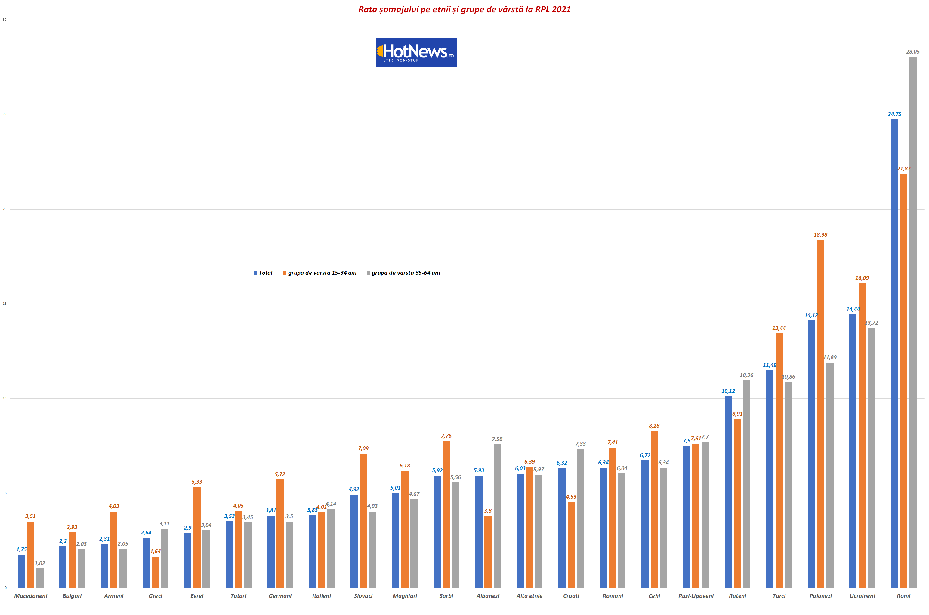 Șomajul în rândul romilor a fost anul trecut de aproape 25%, iar pentru cei de peste 35 de ani, de aproape 29%. În cazul ucrainenilor, rata șomajului e de aproape 3 ori mai mare decât media pe țară, iar cei de vârstă 35-64 de ani au o rată și mai ridicată. Nu mult mai bine stă populația de etnie turcă.