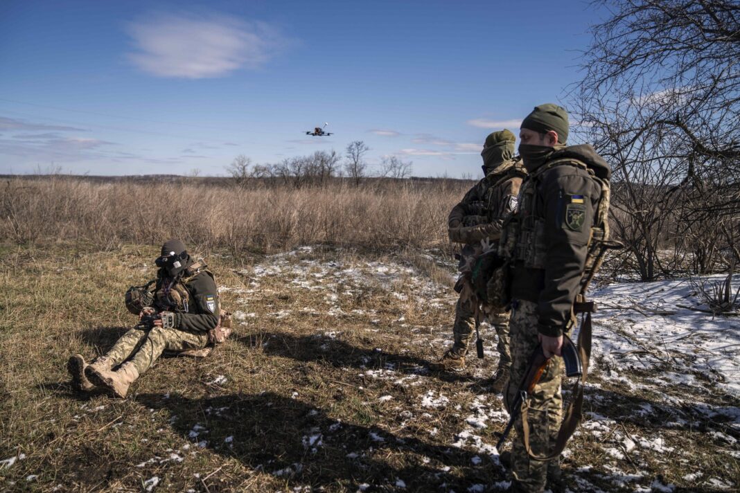 Soldați ucraineni din Brigada 42 observă cum un operator de drone controlează o dronă kamikaze, 19 martie 2025. Credit line: AA/ABACA / Abaca Press / Profimedia