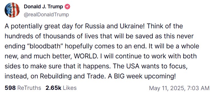 „O zi care ar putea fi una mare pentru Rusia și Ucraina! Gândiți-vă la sutele de mii de vieți care vor fi salvate pe măsură ce această „baie de sânge” fără sfârșit se va încheia. Va fi o LUME cu totul nouă și mult mai bună“, a scris Trump pe rețeaua sa, Truth Social.