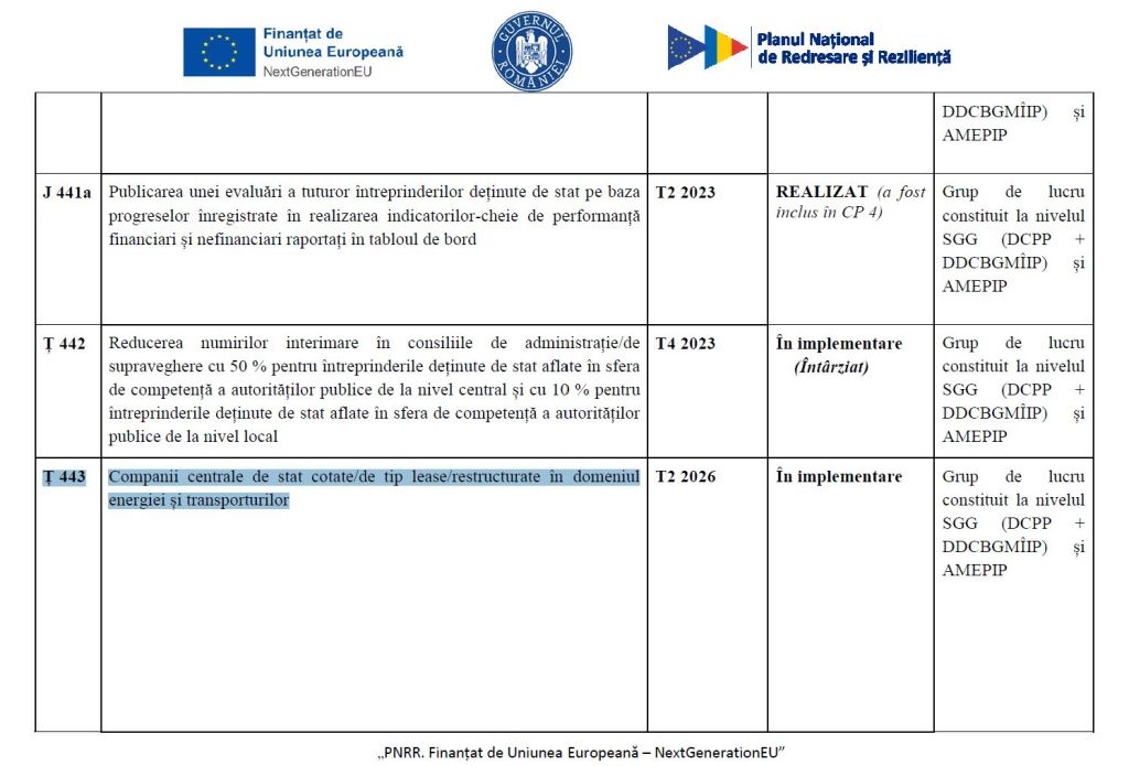 Jalonul 443 din PNRR, Componenta 14 – Buna Guvernanță, stabilește termenul de 31 august 2026 pentru restructurarea sau listarea a cel puțin trei companii de stat cu parcurs ireversibil demonstrabil față de Comisia Europeană. Jalonul are o alocare de 70 milioane de euro.