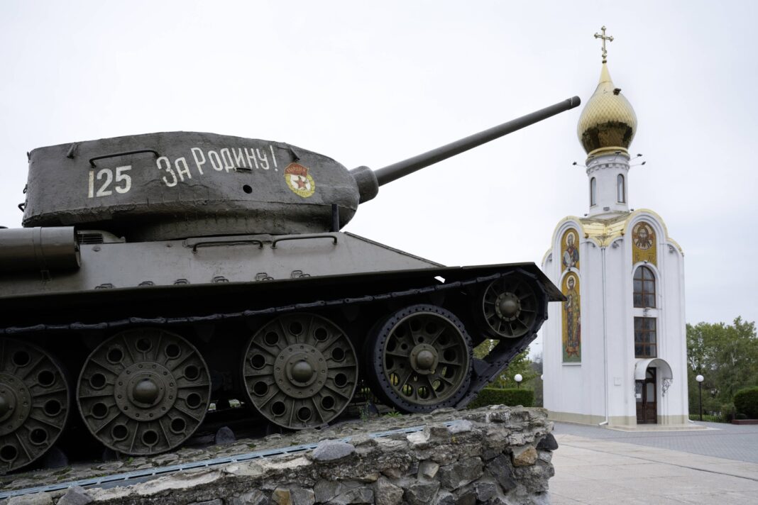 Fotografie ilustrativă – Un tanc T34 rusesc, montat pe un memorial din orașul Tiraspol, în regiunea separatistă Transnistria, Republica Moldova, 20 octombrie 2024.