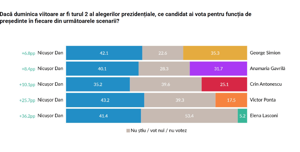 Și în toate, Nicușor Dan ar lua cele mai multe voturi, indiferent de adversar. Singurele lucruri care se schimbă sunt diferența de voturi și numărul celor care nu știu cu cine ar vota, nu votează sau anulează votul.