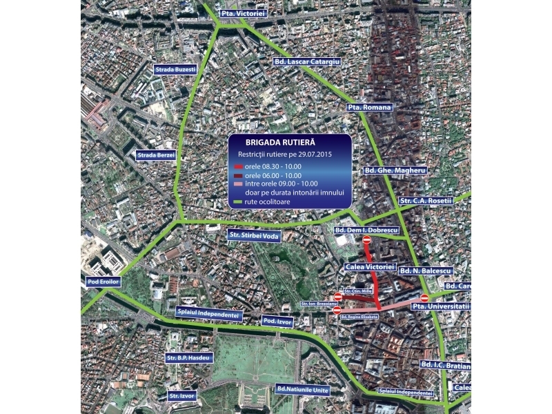 Potrivit unui comunicat de presă al Municipalităţii, traficul rutier va fi întrerupt, în intervalul orar 8:00-10:00, pe Calea Victoriei, între intersecţia cu str. Ion Câmpineanu şi intersecţia cu b-dul Regina Elisabeta. De asemenea, circulaţia rutieră va fi sistată, în intervalul orar 6:00-10:00, pe str. Constantin Mille, iar în intervalul orar 8:30-10:00, pe b-dul Regina Elisabeta – banda 1, între intersecţia cu Calea Victoriei şi intersecţia cu str. Actor Ion Brezoianu (pe sensul de mers către str. Actor Ion Brezoianu).