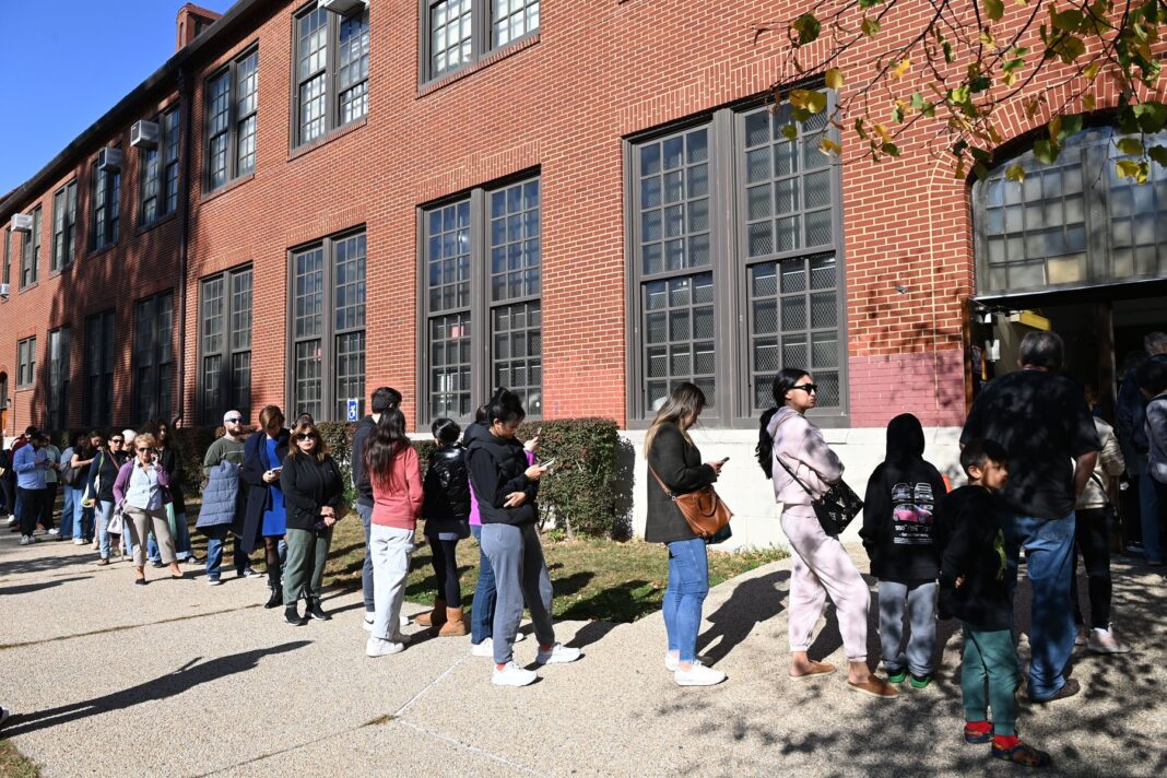 Alegători care așteaptă la coadă, în Forest Hills, Queens, New York, pentru a putea vota în sfârșit fie pentru fostul președinte Donald Trump, fie pentru vicepreședinta Kamala Harris, în cadrul alegerilor prezidențiale de anul acesta. NY, SUA, 5 noiembrie 2024.