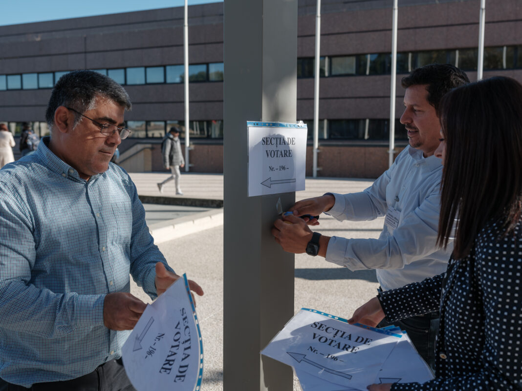 Membrii secției de votare nr. 196 în Montpellier, Franța, lipesc afișele cu informații înainte de deschidere secției. 22 noiembrie 2024, prima zi de vot în diaspora, primul tur al alegerilor prezidențiale