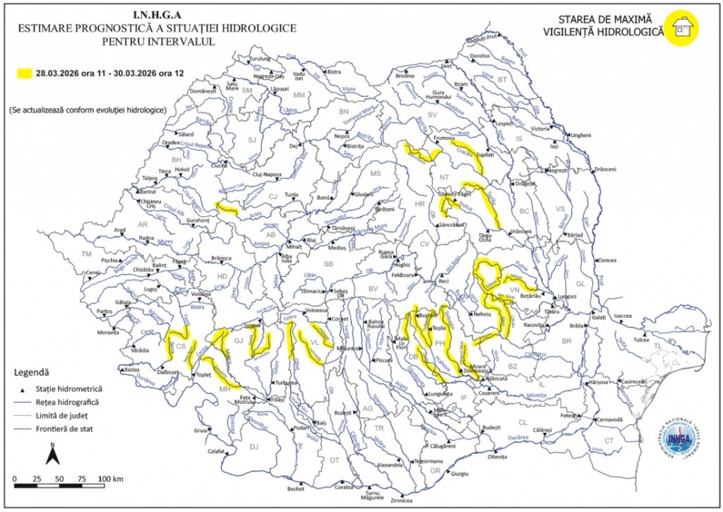 Institutul Național de Hidrologie și Gospodărire a Apelor a emis un cod galben de inundați care vizează bazinele hidrografice ale unor râuri din 16 județe.