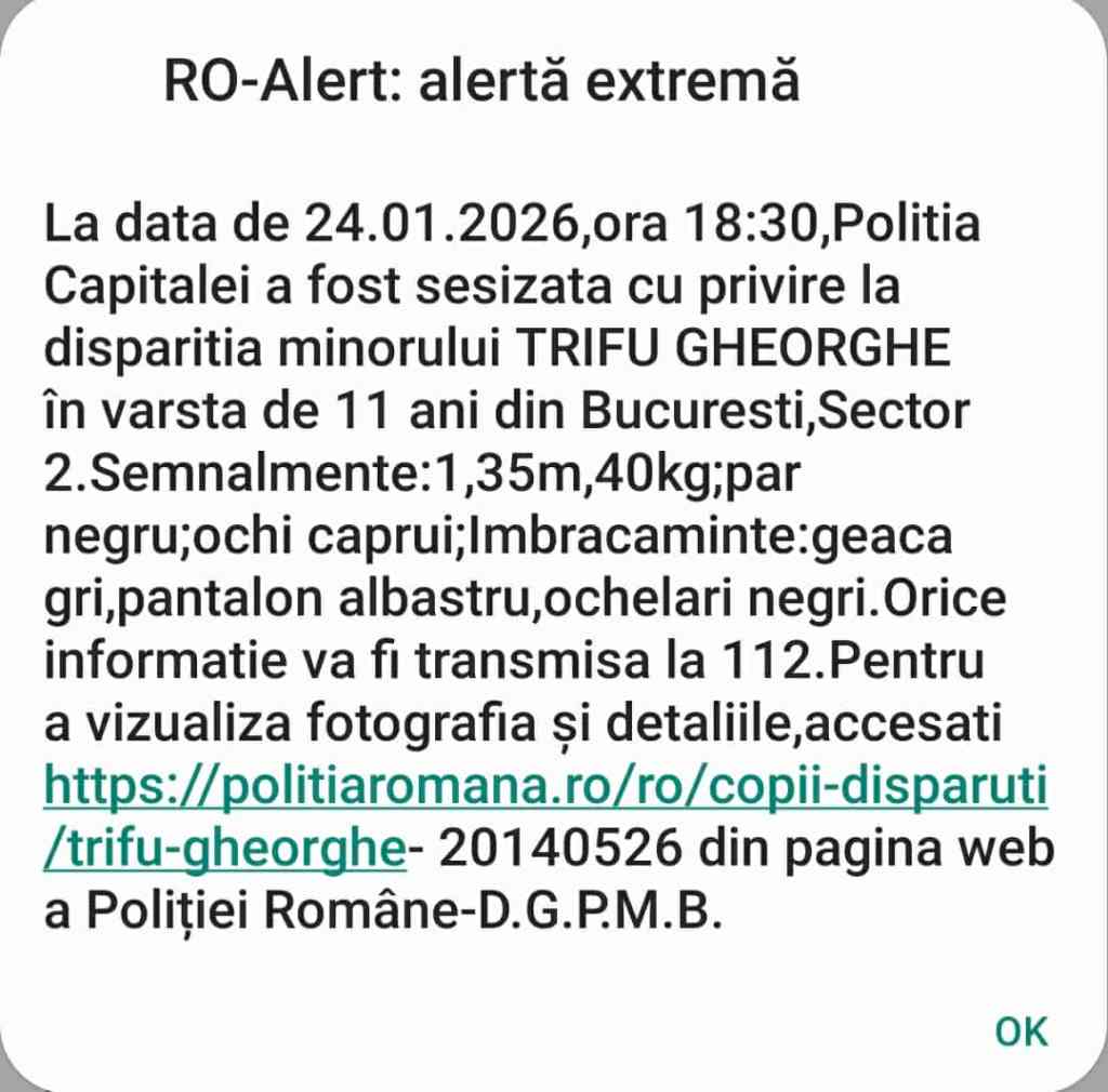 „La data de 24.01.2026, ora 18:30, Poliția Capitalei a fost sesizată cu privire la dispariția minorului TRIFU GHEORGHE în varsta de 11 ani din București, Sector 2. Semnalmente: 1,35m, 40kg; par negru; ochi caprui; Îmbrăcăminte: geacă gri,pantalon albastru, ochelari negri. Orice informație va fi transmisă la 112”, a fost mesajul RO-Alert transmis de autorități.