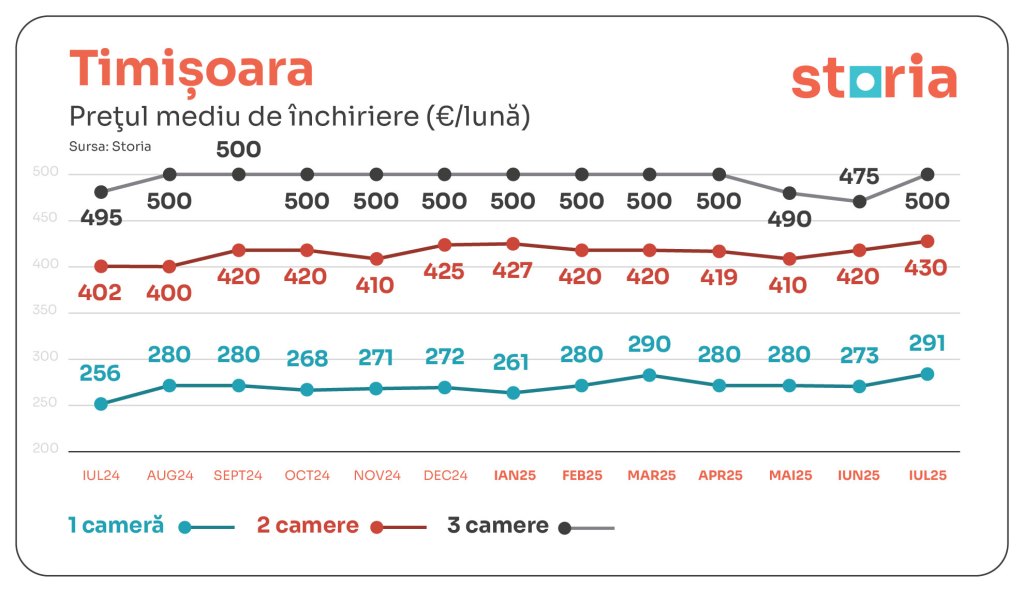 TIMIȘOARA: Cele mai mari creșteri ale lunii iulie se observă la garsoniere (+14%), care au ajuns la un preț mediu de 291 de euro. Chiriile pentru apartamentele cu două camere au crescut cu 7% (430 euro), iar cele pentru apartamentele cu trei camere au crescut ușor, cu doar 1%, ajungând la 500 de euro.