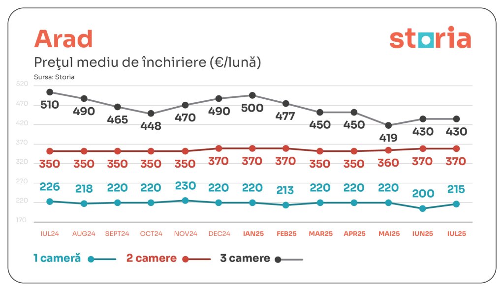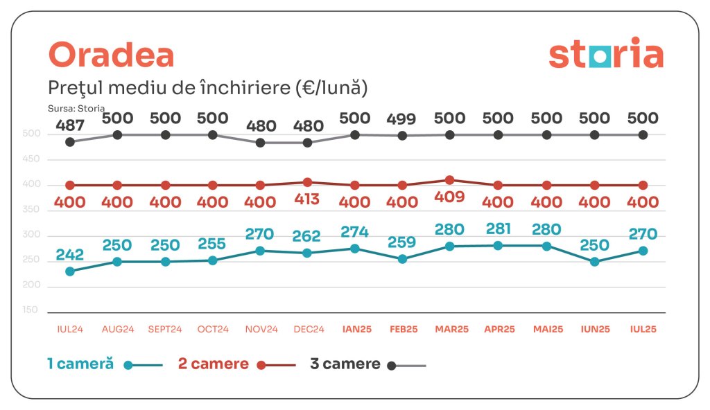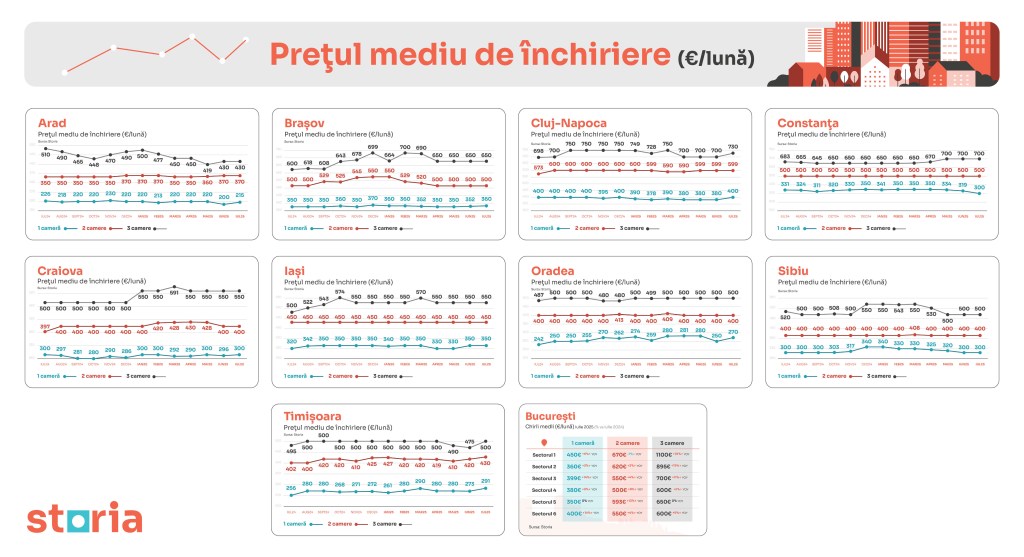 În iulie 2025, prețurile chiriilor s-au menținut relativ stabile comparativ cu luna precedentă, însă au înregistrat o creștere medie de 5% față de aceeași perioadă din 2024, pentru apartamentele cu 1 până la 4 camere. Cele mai ridicate prețuri medii se regăsesc în București, în special în Sectorul 1 (750 euro) și Sectorul 2 (675 euro), conform prețurilor medii din anunțurile publicate pe Storia, platforma de imobiliare lansată de OLX. La polul opus, cele mai accesibile chirii sunt în Arad (360 euro) și Timișoara (420 euro).