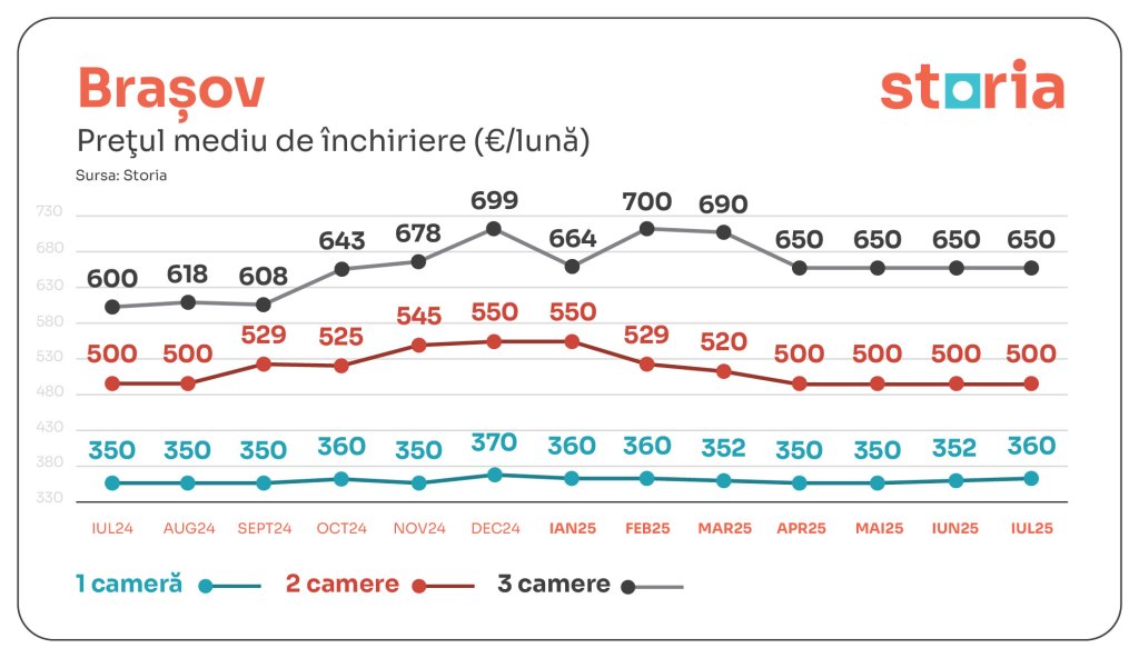 BRAȘOV: Chiriile au rămas stabile pentru apartamentele cu două camere (500 euro), în timp ce garsonierele au înregistrat o ușoară creștere (+3%), ajungând la 360 de euro. Apartamentele cu trei camere s-au scumpit cu 8%, situându-se la 650 de euro.