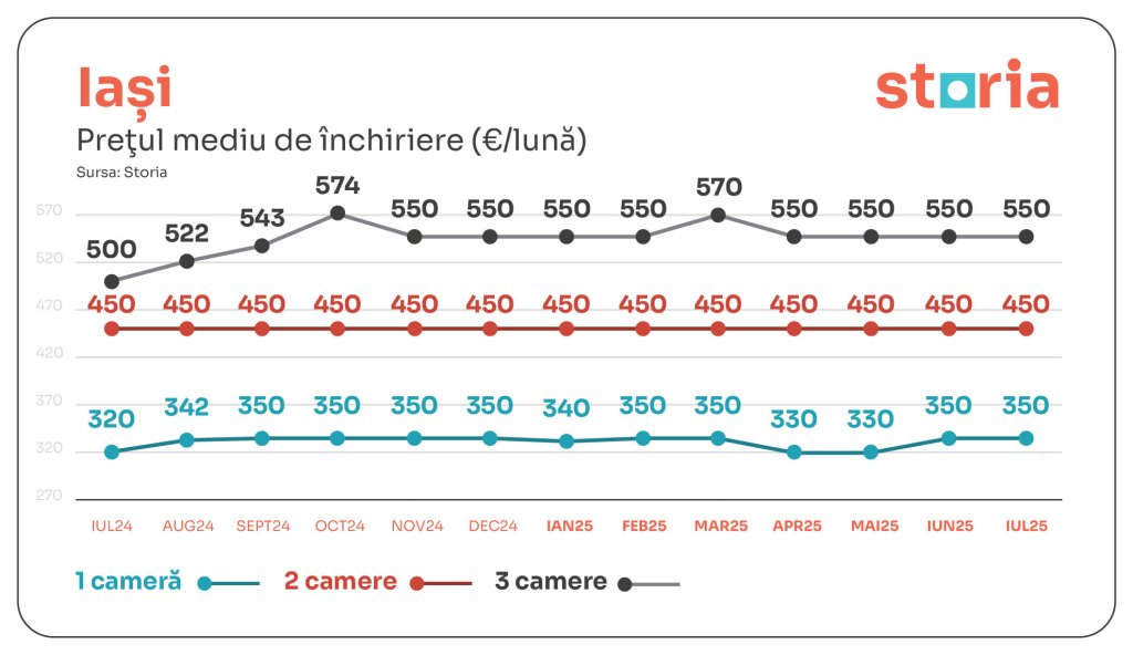 IAȘI: În luna iulie, chiriile pentru garsoniere au ajuns la 350 de euro, în creștere cu 9% față de anul trecut. Apartamentele cu trei camere s-au scumpit, de asemenea, cu 10%, până la 550 de euro. În schimb, chiria medie pentru apartamentele cu două camere s-a menținut la același nivel ca în 2024 – 450 de euro.