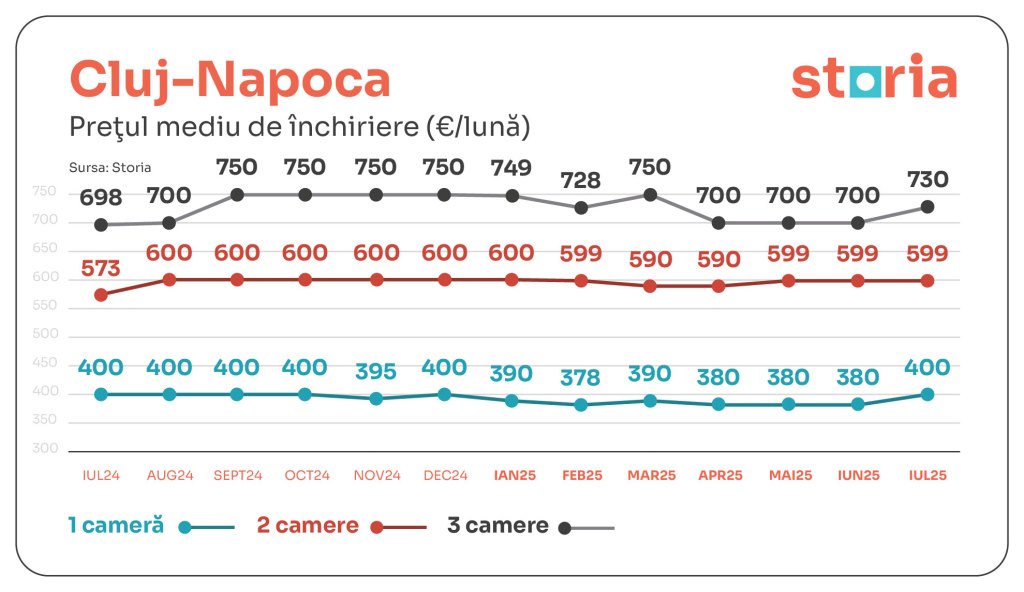CLUJ-NAPOCA se menține printre orașele cu cele mai mari chirii din țară, cu valori medii în ușoară creștere față de aceeași lună a anului trecut. Prețul garsonierelor s-a menținut constant, la 400 de euro, în timp ce apartamentele cu două camere s-au scumpit cu 5%, ajungând la 599 de euro. Pentru locuințele cu trei camere, chiria medie a crescut tot cu 5%, până la 730 de euro.