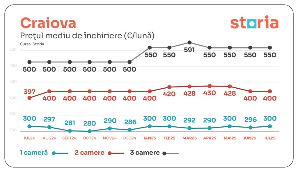 CRAIOVA: Față de aceeași perioadă a anului trecut, chiriile pentru garsoniere s-au menținut la 300 de euro. Apartamentele cu două camere au crescut ușor (+1%), ajungând la 400 de euro, iar cele cu trei camere s-au apreciat cu 10%, până la 550 de euro.