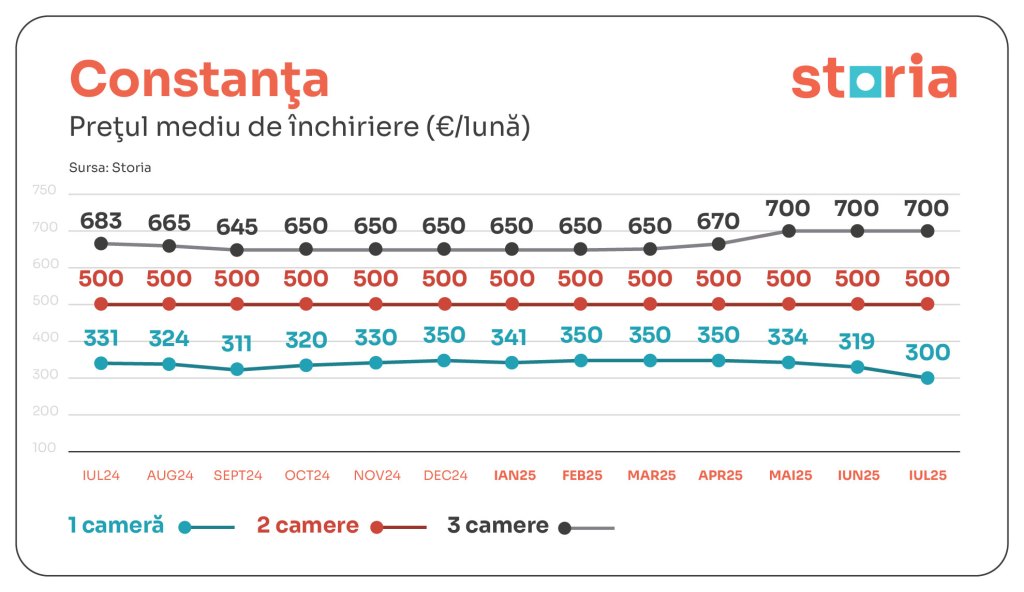 CONSTANȚA: Prețul mediu pentru garsoniere a scăzut cu 9% față de anul trecut, ajungând la 300 de euro. Apartamentele cu două camere s-au menținut la 500 de euro, iar cele cu trei camere s-au apreciat ușor, până la 700 de euro (+2%).
