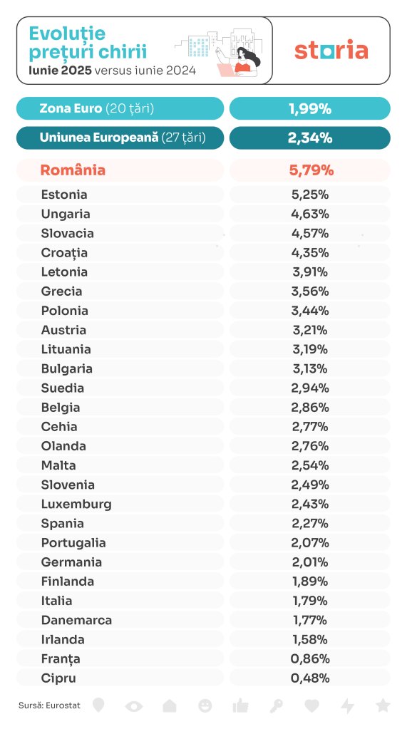 Datele publicate de Eurostat pentru luna iunie 2025 arată că România a înregistrat cea mai mare creștere a chiriilor din Uniunea Europeană comparativ cu iunie 2024. Mai exact, chiriile au crescut în țara noastră cu 5,8%, într-un ritm de peste două ori mai mare comparativ cu media Uniunii Europene de 2,3%.