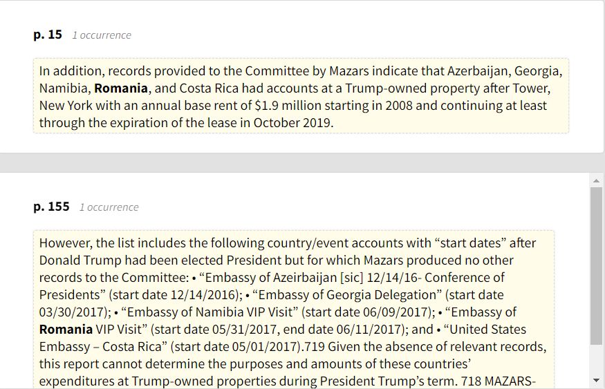 România apare în raportul „Casa Albă de vânzare” alături de un grup mai mic de țări, Azerbaidjan, Georgia, Namibia și Costa Rica, care au plătit pentru cazare în hotelurile lui Trump, dar nu este specificată suma.
