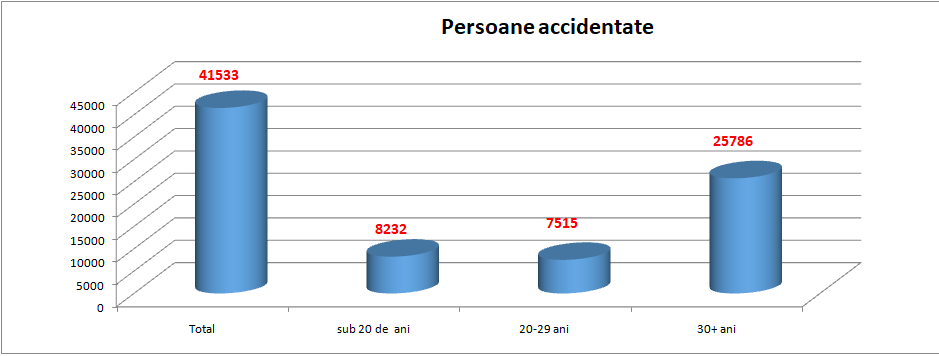 Din totalul celor peste 40.000 de persoane accidentate anul trecut, cele mai multe aveau peste 30 de ani. De remarcat de asemenea că numărul victimelor sub 20 de ani este mai ridicat decât al celor din categoria de vârstă 20-29 de ani.