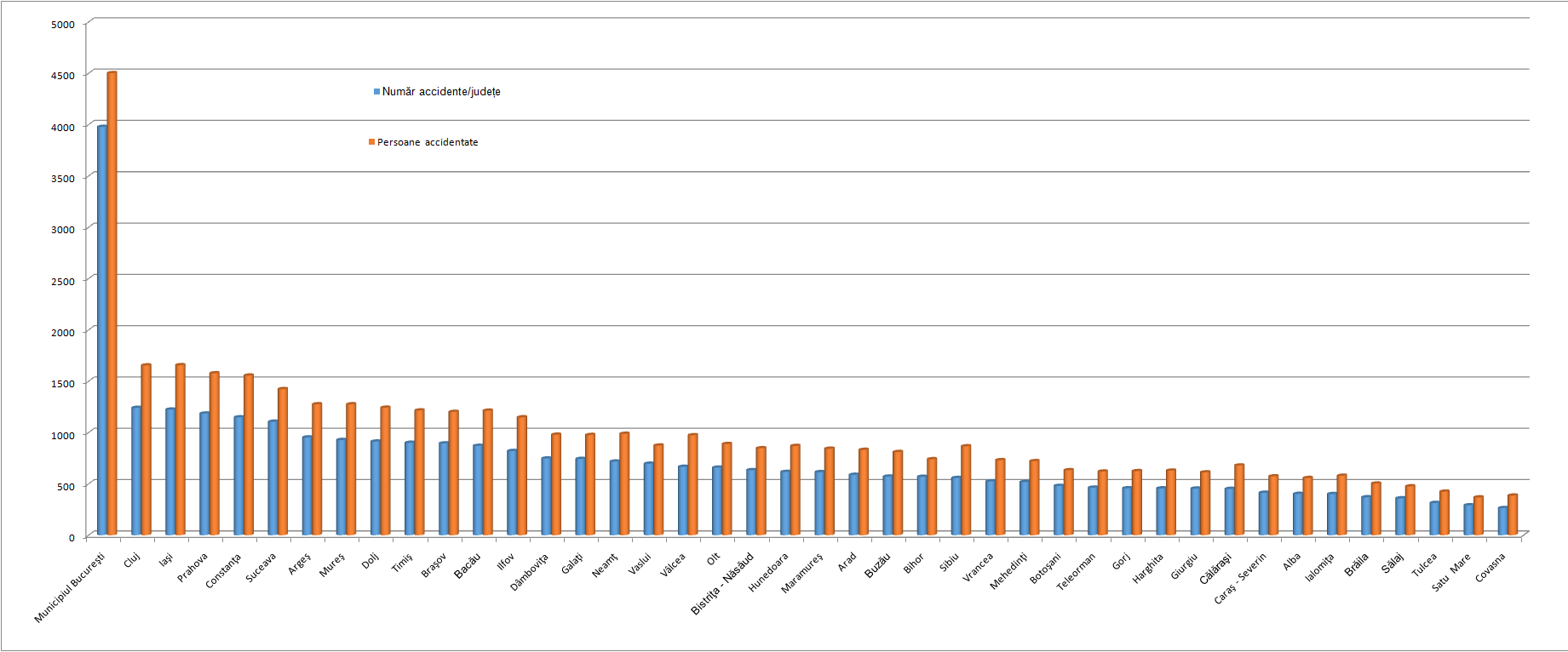 Dacă ne uităm la date, raportându-le la județe, Capitala este locul cel mai periculos pentru șofat. E drept, aici sunt și cele mai multe mașini. A propos, în România sunt circa 7 milioane de autoturisme înmatriculate. Revenind la județe, București e urmat de Cluj, Iași, Prahova și Constanța. În graficul de mai jos, barele albastre reprezintă numărul de accidente, iar cele cărămizii, numărul persoanelor accidentate.