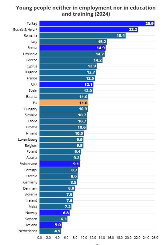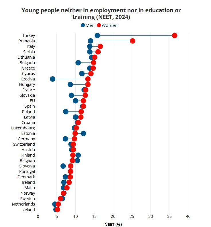 Deși Uniunea Europană spune că vrea să reducă procentul de 11% sub 9 % până în 2030, doar 11 din 34 de țări europene au atins deja acest obiectiv în 2024. În unele țări, cum este cazul României, nu doar ponderea tinerilor care nu au serviciu și nu studiază este ridicată, dar și cea a diferențelor între sexe.