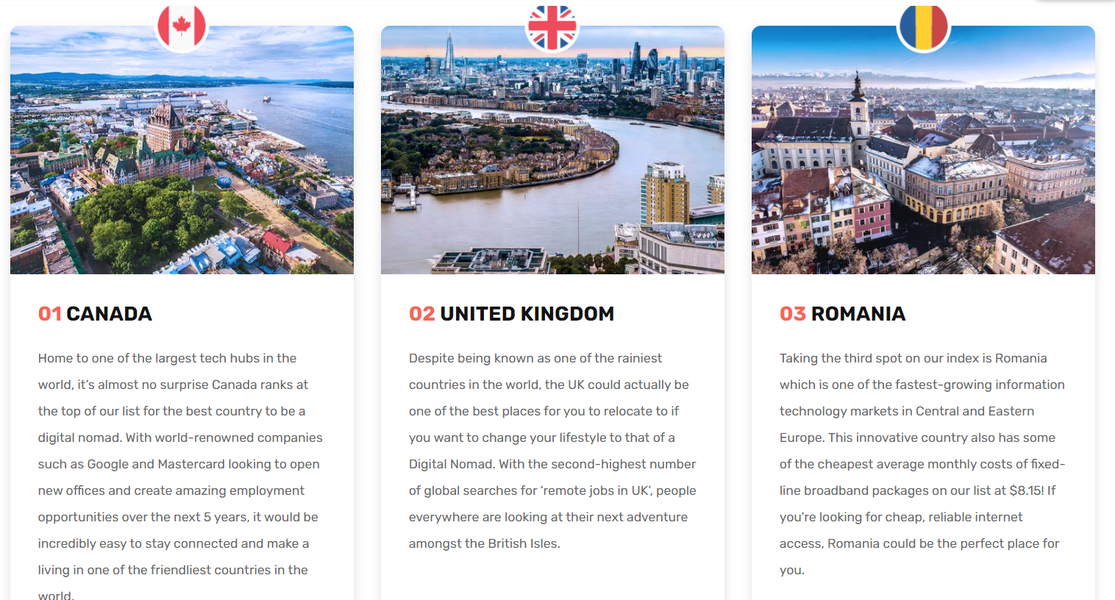 Locul al treilea este ocupat de România – o țară care, aș putea paria, nu se află pe radarul multor nomazi digitali. Dar, fiind una dintre piețele de tehnologii ale informației cu cea mai rapidă creștere din Europa Centrală și de Est, este o asociere excelentă de oportunități și costuri de viață fantastic de reduse – pachetele de bandă largă cu linie fixă foarte rapide costă aproximativ 8 USD pe lună!