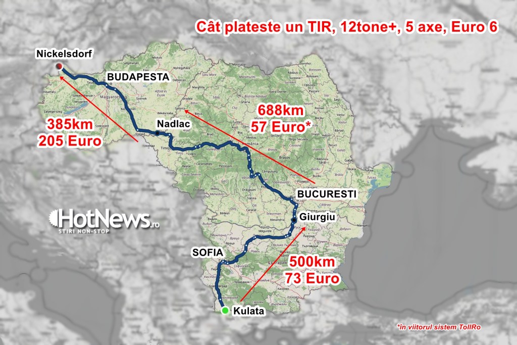 Jurnaliștii de la Mediapol.bg au făcut pentru HotNews un calcul ipotetic: un TIR de 12+ tone care străbate țara de la sud, dinspre Grecia, de la vama Kulata și ajunge până la Ruse, la podul peste Dunăre spre Giurgiu. Un astfel de traseu are o lungime de 500,89 km, din care circa 450 km sunt supuși taxării. Pentru acest traseu TIR-ul va plăti în total 73,02 euro, conform estimărilor făcute de jurnaliștii bulgari.