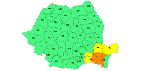 Cod portocaliu de caniculă (9 iulie): valabil între ora 10:00 și 21:00, în estul Ialomiței și Călărașiului, precum și vestul județului Constanța. Temperaturile maxime vor fi de 36–38 de grade, cu ITU ridicat.