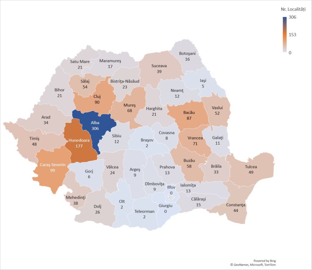 Așadar, conform studiului, populația din 1.635 de localități din 39 de județe nu are acces sau are acces parțial la servicii de comunicații electronice în bandă largă, printre care enumerăm județele Alba, Hunedoara și Caraș-Severin care au cele mai multe localități neacoperite, respectiv 306, 177 și respectiv 99 de localități.