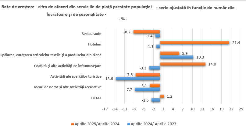 Creşteri au înregistrat serviciile de coafură şi alte activităţi de înfrumuseţare (+22,0%), activităţile de spălare şi curăţare (uscată) a articolelor textile şi a produselor din blană (+7,7%) și activităţile hotelurilor şi restaurantelor (+0,9%).