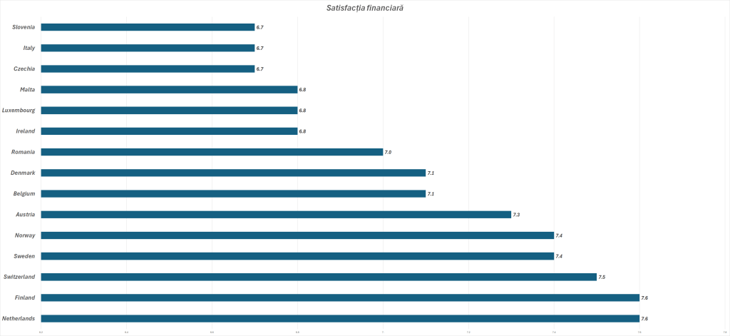 Dintre toți europenii, finlandezii și olandezii (7,6) sunt cei mai mulțumiți de situația lor financiară personală, arată datele Eurostat. România iese în evidență în mod pozitiv pentru că, deși suntem înconjurați de țări în care oamenii își evaluează situația financiară personală cu o notă între 4 și 5 (pe o scară de la 1 la 10), românii sunt foarte mulțumiți de situația lor financiară personală, acordându-i o medie de 7,0.