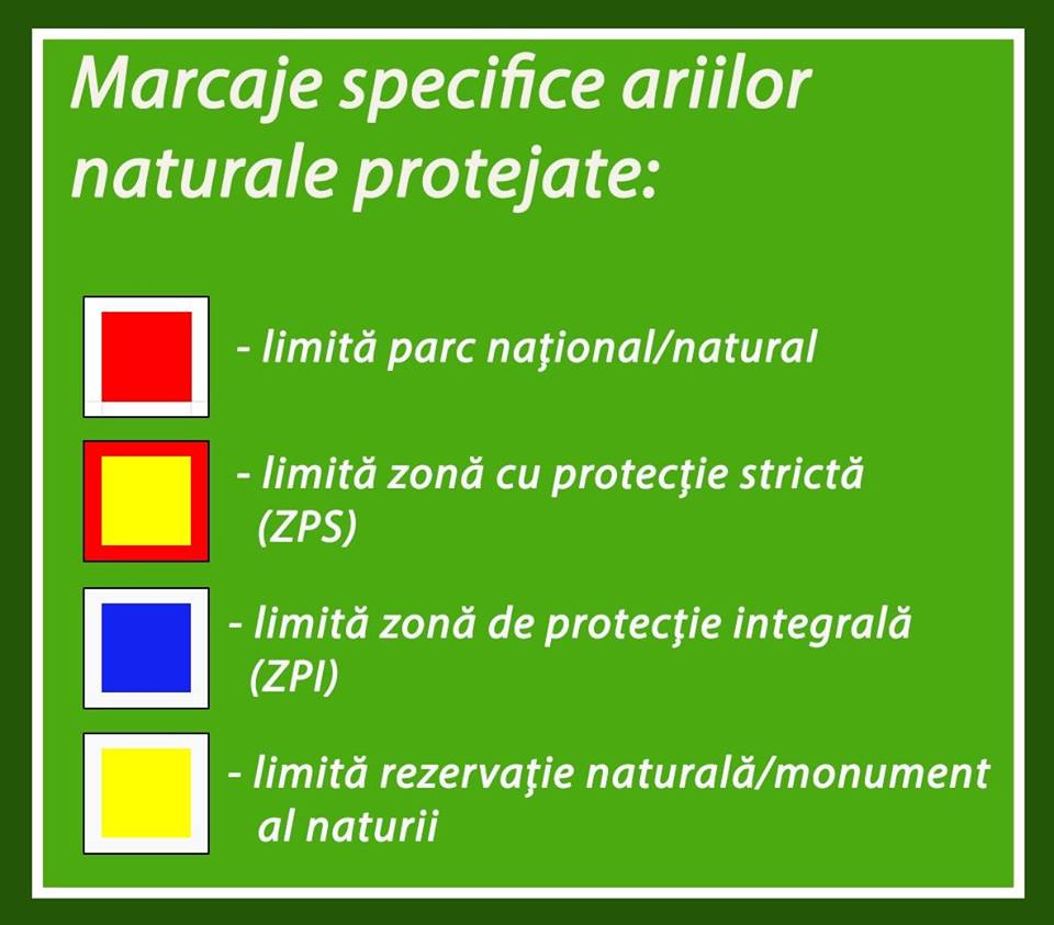 Vă prezentăm, mai jos, un vizual cu marcajele specifice ariilor naturale protejate. Este important de menționat că acestea sunt diferite de marcajele specifice traseelor turistice, după cum se poate obersva din cea de-a doua imagine.