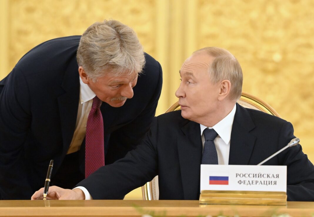 Președintele rus Vladimir Putin (dreapta) și purtătorul său de cuvânt, Dmitri Peskov (stânga), în timpul summitului Comunității Statelor Independente, la Kremlin, Moscova, 8 octombrie 2024.