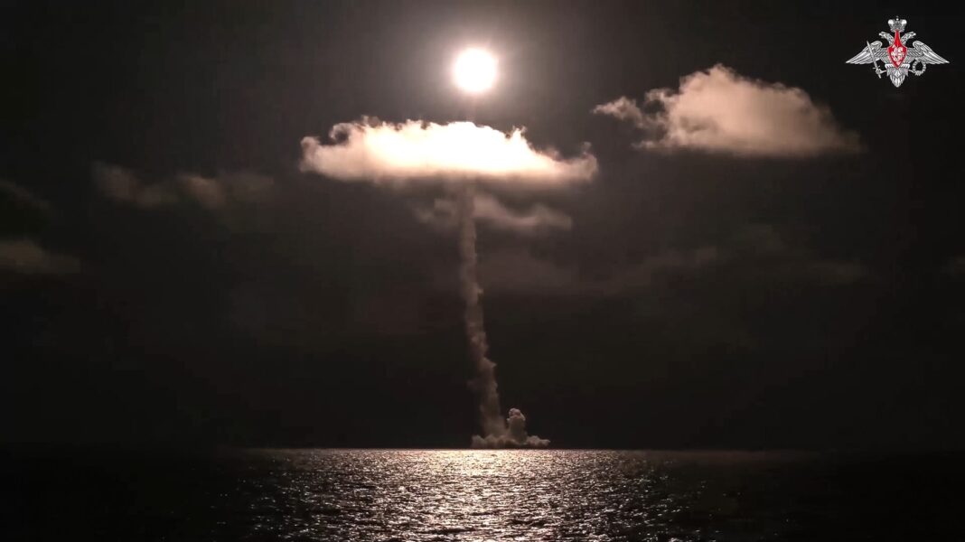 În această fotografie publicată de Ministerul rus al Apărării, pe 5 noiembrie 2023, submarinul nuclear „Împăratul Alexandru al III-lea” al marinei ruse testează o rachetă balistică intercontinentală Bulava, în Marea Albă.