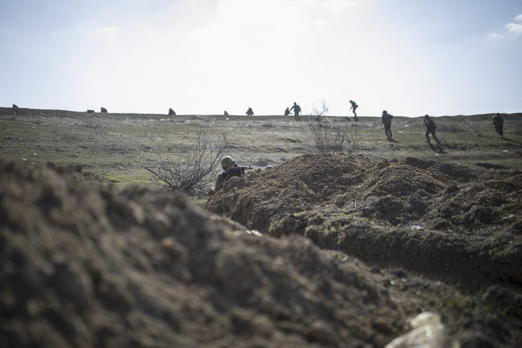 REGIUNEA HERSON, UCRAINA – 14 MARTIE 2024: Soldați din marina ucraineană participă la un antrenament de tragere, pregătindu-se pentru o rotație pe linia frontului.