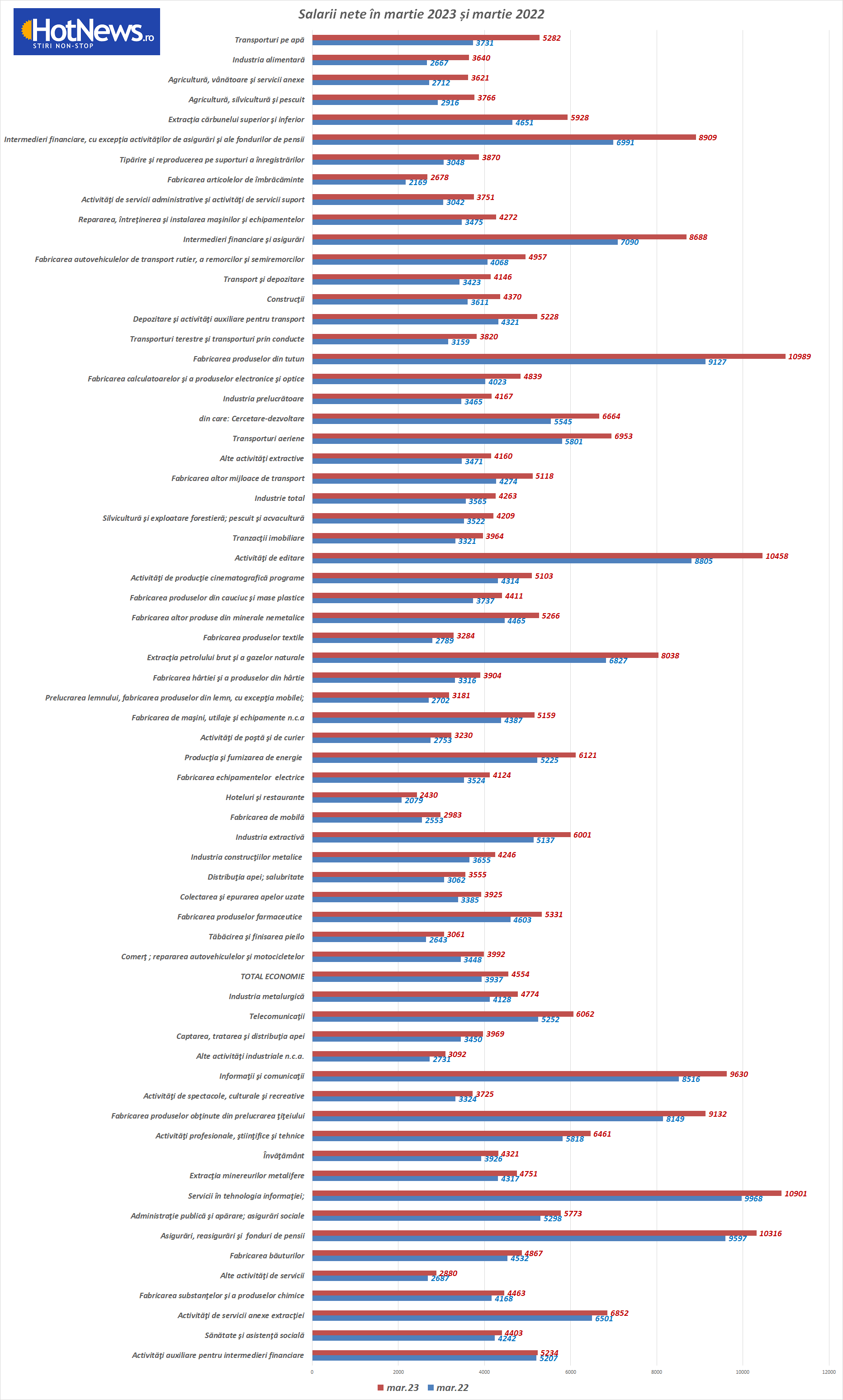 Angajații din domeniul transporturilor navale (de pasageri și mărfuri) și lucrătorii din industria alimentară au avut cele mai mari creșteri ale salariului net în martie, lună în care s-a sărbătorit și Paștele, o sărbătoare însoțită de regulă și de acordarea de prime suplimentare, arată datele INS.