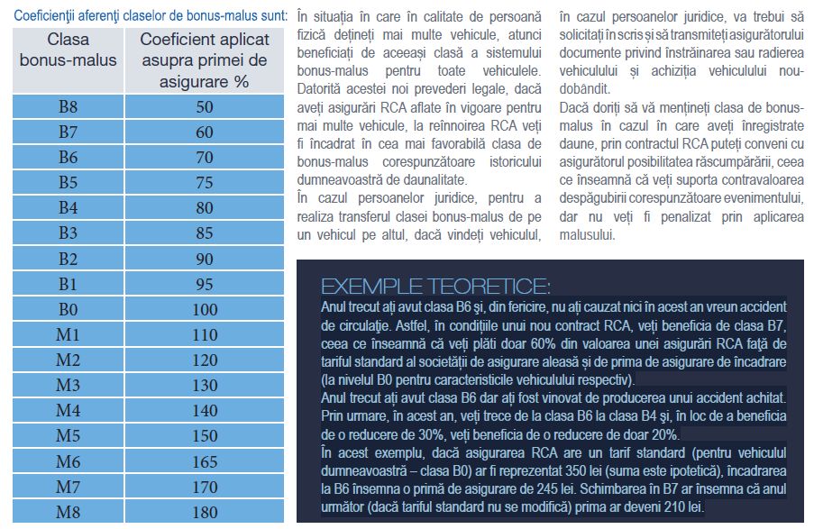 În situaţia în care în perioada de referință nu au fost înregistrate daune plătite, la reînnoirea poliței RCA vei beneficia de un bonus, respectiv o reducere a primei de asigurare. În situația în care în perioada de referință au fost înregistrate daune plătite, la reînnoirea poliței RCA vei fi penalizat prin aplicarea unui malus, respectiv majorarea primei de asigurare. Malusul se aplică la reînnoirea poliţei de asigurare în anul următor celui în care au fost plătite daune pe baza poliței RCA.