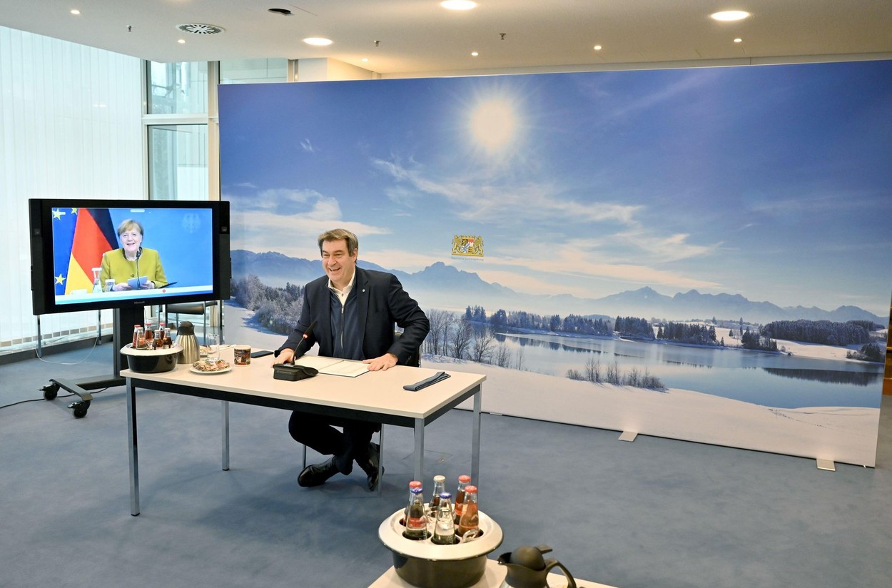 Angela Merkel în timpul unei videoconferințe cu premierul bavarez Markus Soder (FOTO: dpa Picture Alliance / Alamy / Profimedia Images)