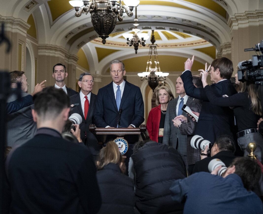 Liderul majorității republicane din Senatul Statelor Unite, John Thune, vorbește în fața presei, la Capitolul SUA din Washington, DC, pe 16 decembrie 2025.