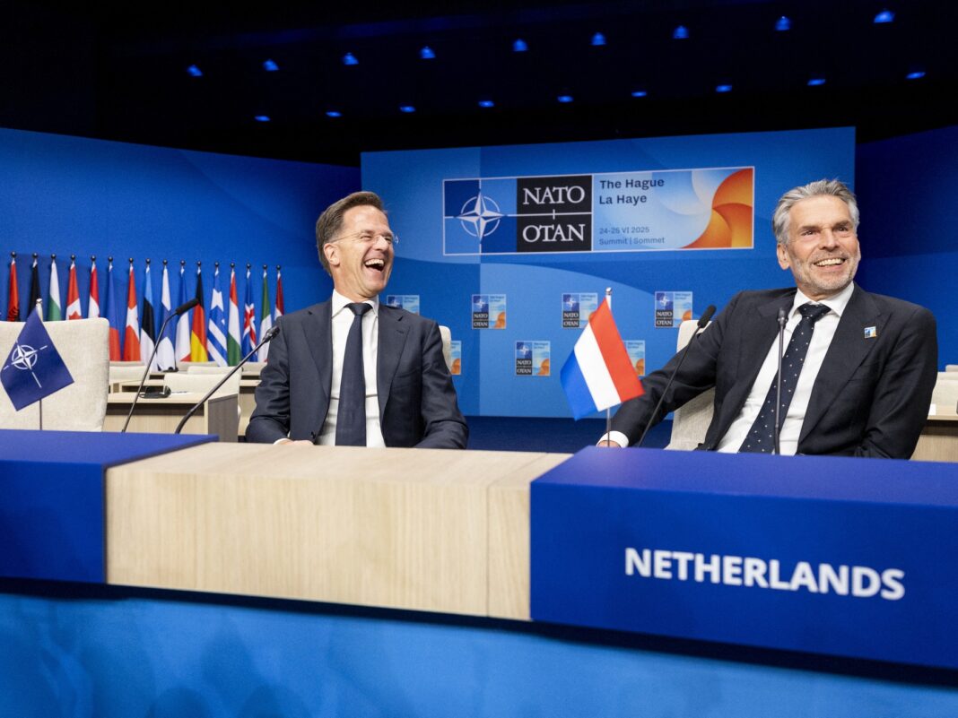 Mark Rutte alături de premierul demisionar al Olandei, Dick Schoof, fotografiați la un eveniment organizat înaintea summitului NATO ce a avut loc la Haga în iunie 2025, FOTO: Robin van Lonkhuijsen / AFP / Profimedia Images