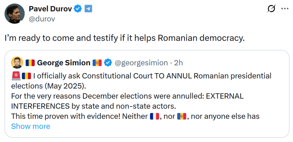 „Sunt gata să vin și să depun mărturie dacă asta ajută democrația românească”,a scris Pavel Durov pe X.